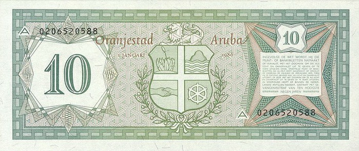 Лицевая сторона банкноты Арубы номиналом 10 Флоринов Обратная сторона банкноты Арубы номиналом 10 Флоринов