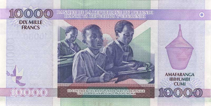 Лицевая сторона банкноты Бурунди номиналом 10000 Франков Обратная сторона банкноты Бурунди номиналом 10000 Франков