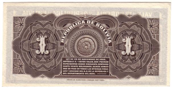 Лицевая сторона банкноты Боливии номиналом 1 Боливиано Обратная сторона банкноты Боливии номиналом 1 Боливиано