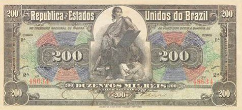 Лицевая сторона банкноты Бразилии номиналом 200 Мильрейсов Обратная сторона банкноты Бразилии номиналом 200 Мильрейсов