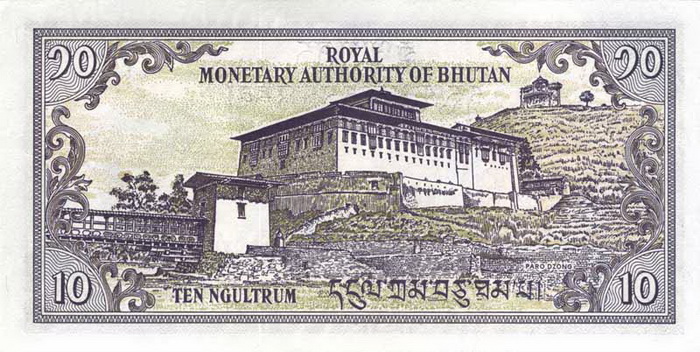 Лицевая сторона банкноты Бутана номиналом 10 Нгултрумов Обратная сторона банкноты Бутана номиналом 10 Нгултрумов