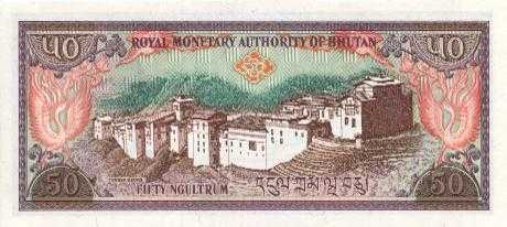 Лицевая сторона банкноты Бутана номиналом 50 Нгултрумов Обратная сторона банкноты Бутана номиналом 50 Нгултрумов