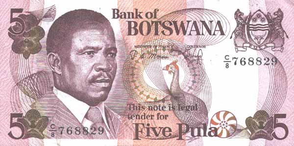 Лицевая сторона банкноты Ботсваны номиналом 5 Пул Обратная сторона банкноты Ботсваны номиналом 5 Пул