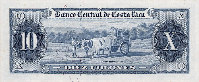 Лицевая сторона банкноты Коста-Рики номиналом 10 Колонов Обратная сторона банкноты Коста-Рики номиналом 10 Колонов