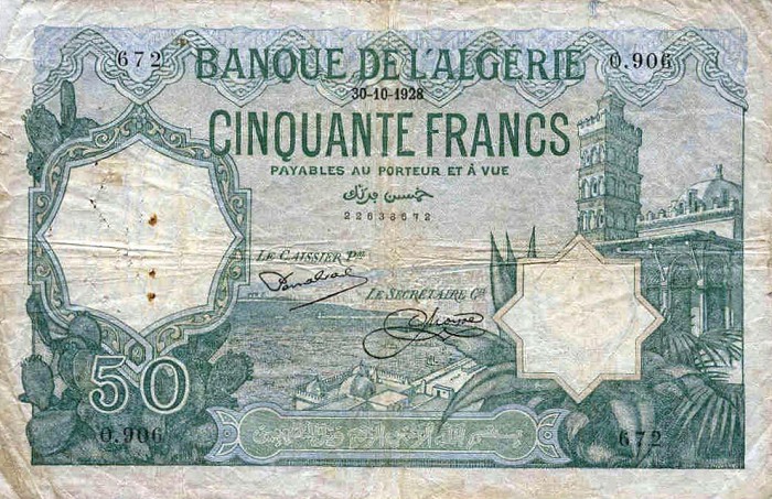 Лицевая сторона банкноты Алжира номиналом 50 Франков Обратная сторона банкноты Алжира номиналом 50 Франков