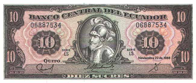 Лицевая сторона банкноты Эквадора номиналом 10 Сукре Обратная сторона банкноты Эквадора номиналом 10 Сукре