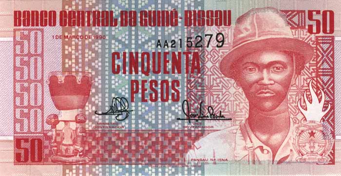 Лицевая сторона банкноты Гвинеи-Бисау номиналом 50 Песо Обратная сторона банкноты Гвинеи-Бисау номиналом 50 Песо