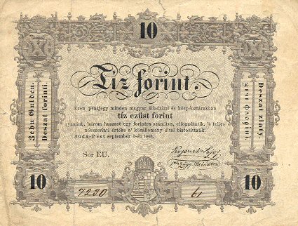 Лицевая сторона банкноты Венгрии номиналом 10 Форинтов Обратная сторона банкноты Венгрии номиналом 10 Форинтов