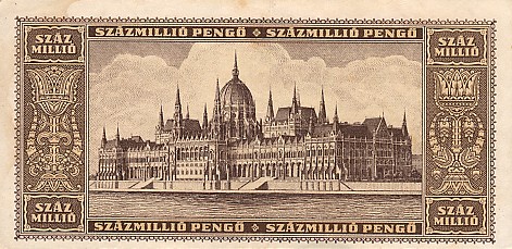 Лицевая сторона банкноты Венгрии номиналом 100000000 Пенге Обратная сторона банкноты Венгрии номиналом 100000000 Пенге