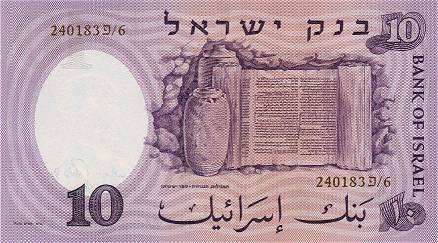 Лицевая сторона банкноты Израиля номиналом 10 Лирот Обратная сторона банкноты Израиля номиналом 10 Лирот