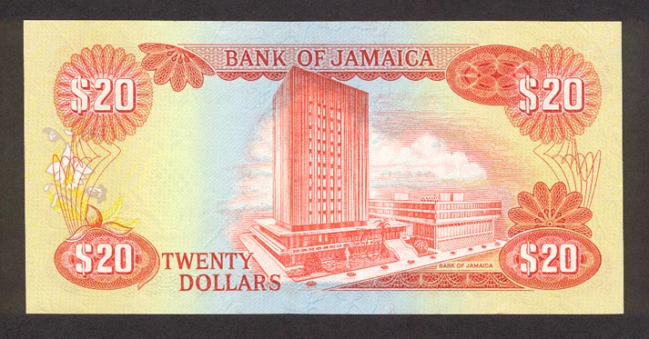Лицевая сторона банкноты Ямайки номиналом 20 Долларов Обратная сторона банкноты Ямайки номиналом 20 Долларов