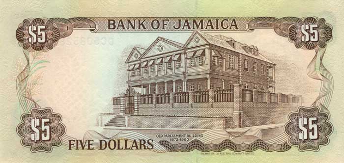 Лицевая сторона банкноты Ямайки номиналом 5 Долларов Обратная сторона банкноты Ямайки номиналом 5 Долларов