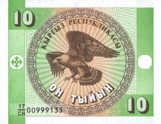 Лицевая сторона банкноты Киргизии номиналом 1/10 Сома Обратная сторона банкноты Киргизии номиналом 1/10 Сома