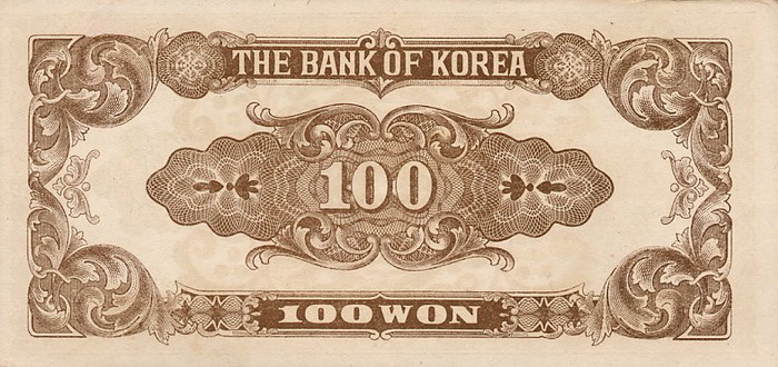 Лицевая сторона банкноты Южной Кореи номиналом 100 Вон Обратная сторона банкноты Южной Кореи номиналом 100 Вон