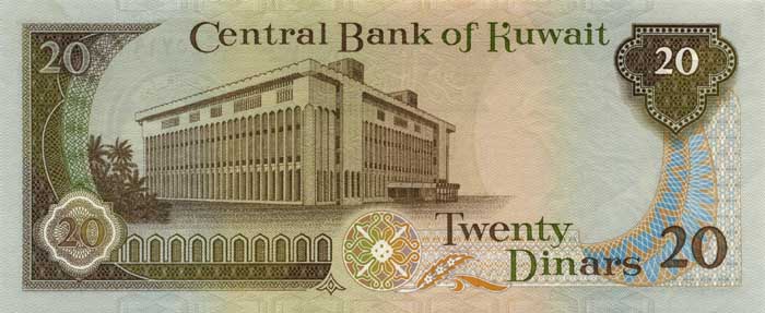 Лицевая сторона банкноты Кувейта номиналом 20 Динаров Обратная сторона банкноты Кувейта номиналом 20 Динаров