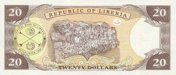 Лицевая сторона банкноты Либерии номиналом 20 Долларов Обратная сторона банкноты Либерии номиналом 20 Долларов