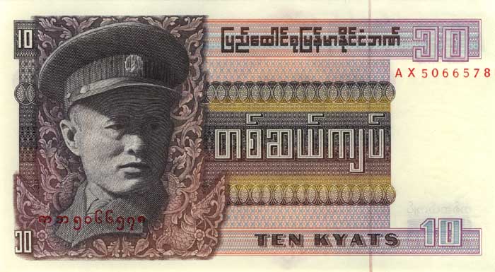 Лицевая сторона банкноты Мьянмы номиналом 10 Кьят Обратная сторона банкноты Мьянмы номиналом 10 Кьят