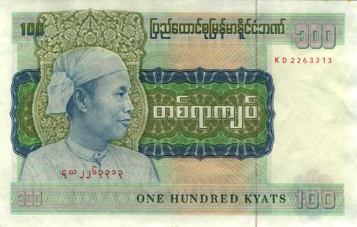 Лицевая сторона банкноты Мьянмы номиналом 100 Кьят Обратная сторона банкноты Мьянмы номиналом 100 Кьят