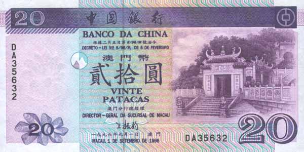 Лицевая сторона банкноты Макао номиналом 20 Патака Обратная сторона банкноты Макао номиналом 20 Патака