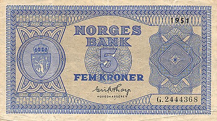 Лицевая сторона банкноты Норвегии номиналом 5 Крон Обратная сторона банкноты Норвегии номиналом 5 Крон