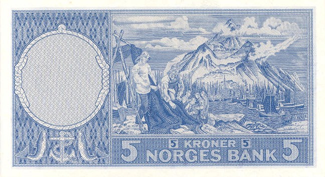 Лицевая сторона банкноты Норвегии номиналом 5 Крон Обратная сторона банкноты Норвегии номиналом 5 Крон