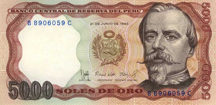 Лицевая сторона банкноты Перу номиналом 5000 Солей де Оро Обратная сторона банкноты Перу номиналом 5000 Солей де Оро