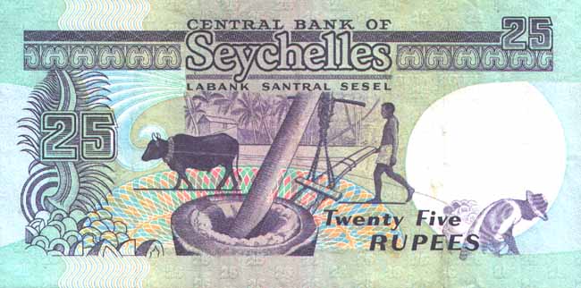 Лицевая сторона банкноты Сейшел номиналом 25 Рупий Обратная сторона банкноты Сейшел номиналом 25 Рупий