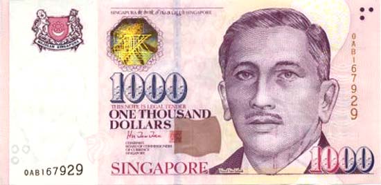 Лицевая сторона банкноты Сингапура номиналом 1000 Долларов Обратная сторона банкноты Сингапура номиналом 1000 Долларов