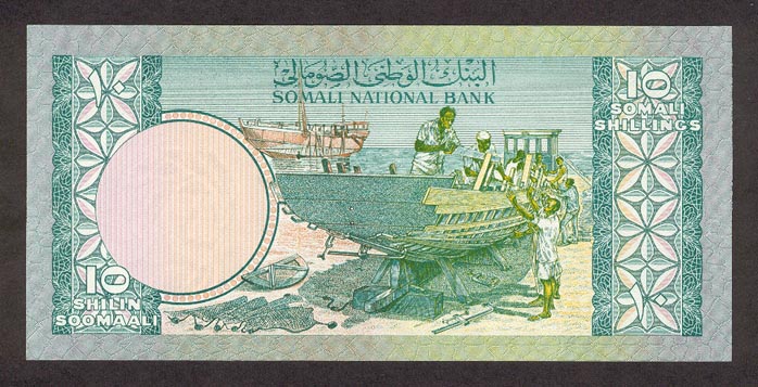 Лицевая сторона банкноты Сомали номиналом 10 Шиллингов Обратная сторона банкноты Сомали номиналом 10 Шиллингов