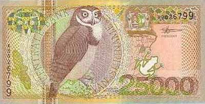 Лицевая сторона банкноты Суринама номиналом 25000 Гульденов Обратная сторона банкноты Суринама номиналом 25000 Гульденов