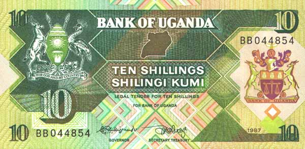 Лицевая сторона банкноты Уганды номиналом 10 Шиллингов Обратная сторона банкноты Уганды номиналом 10 Шиллингов